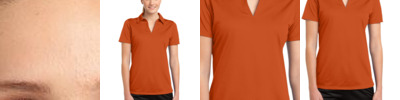 100% polyester; Moisture wicking; Snag resistant; Mechanical stretch; Bold, two-color heather pattern; Self-fabric collar; Elongated V-neckline; Tagless;